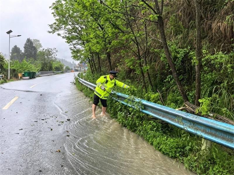执法人员立即靠边停车,冒雨尝试将倒塌的树木推移至护栏外。但由于树木根系尚与泥土部分相连,且树干粗重、枝叶湿滑,执法人员多次努力均未能成功移动。面对这一情况,执法人员迅速调整处置方案,前往收费站借来一把镰刀,准备对倒塌树木进行切割分解。考虑到积水较深、穿着鞋子不便发力且易打滑,执法人员毫不犹豫脱掉鞋袜,光脚踩入冰凉的水流中挥动镰刀,对准枝干一下下用力砍伐。经过十余分钟的紧张作业,倒塌树木被成功切断分解。执法人员随后将散落的枝干逐一清理至波形护栏外侧,彻底恢复了路面畅通。