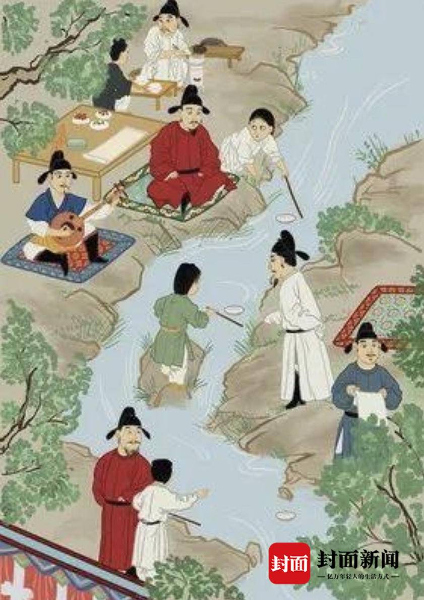 在魏晋时期,上巳节除了要在水边“祓禊”,王公贵族、文人雅士还要在水边吃吃喝喝,吟诗作对,尽显时代风流。因此“曲水流觞”的习俗应运而生——人们坐于环曲的水边,把盛着酒的觞放在流水之上,任酒杯顺流漂下,停在谁面前,谁就要将杯中酒一饮而下,并赋诗一首。这种习俗一直流传到宋代,如今在宜宾甚至还留有宋代的“曲水流觞”之地。那是北宋时期诗人、书法家黄庭坚谪居戎州时,仿王羲之《兰亭集序》“流觞曲水”之意,利用天然峡谷而建,周围摩岩石壁上留下了黄庭坚、杨升庵等历代名人雅士所作书法石刻约130幅,是全国重点文物保护单位。