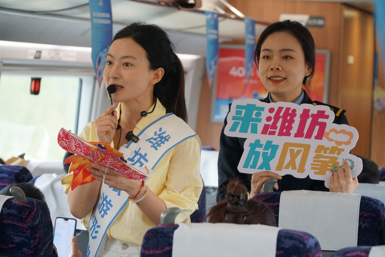列车8号车厢被精心打造为移动潍坊非遗展厅,车厢内布置风筝会主题宣传彩旗,蝴蝶风筝、沙燕风筝等特色装饰点缀其间,地域文化气息浓郁,营造出“人在画中游,车随春风行”的诗意氛围。旅客一踏入车厢,仿佛步入了移动的“风筝文化馆”,提前感受潍坊国际风筝会的热烈气息。行程中,列车开展文旅互动推介,向旅客发放宣传资料与风筝、年画等潍坊特色文创礼品;有奖问答环节围绕潍坊文旅资源展开,旅客踊跃参与,旅途氛围轻松愉悦。