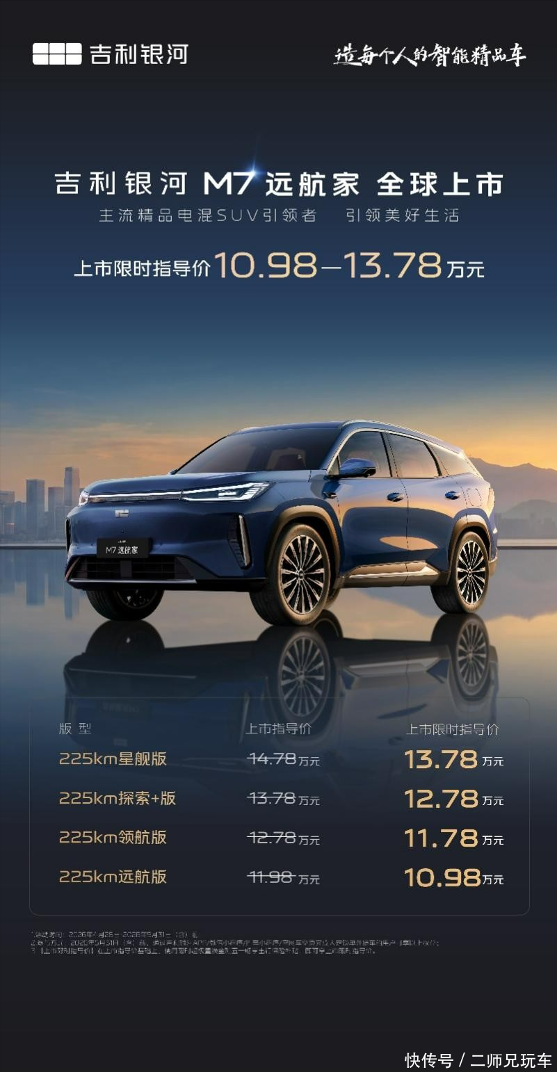 4月28日,“主流精品电混SUV引领者”吉利银河M7远航家正式上市,全系标配长续航225公里。新车共推出4个版型,分别是225km远航版、225km领航版、225km探索+版和225km星舰版,上市限时指导价为10.98万元-13.78万元。即日起,用户可通过吉利银河APP、微信小程序、抖音小程序及官网等官方渠道下定。2026年5月31日(含)前完成大定并提车的用户可享限时超级置换金、五一畅享出行保险补贴,以及上市限时八重权益:焕新礼、金融礼、升舱礼、智行礼、无忧礼、流量礼、交付礼、质保礼等多重福利